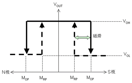 AS系列能夠通過磁鐵和傳感器之間的距離改變來檢測出磁通密度的變化,控制傳感器輸出信號的開關(guān)(高(H)<=>低(L)),如圖5所示。當磁鐵接近傳感器,使磁場的強度變大,則傳感器的輸出就會由“高”變“低”,反之則由“低”變“高”。