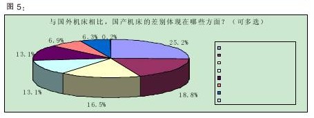 據(jù)中國(guó)機(jī)床工具工業(yè)協(xié)會(huì)統(tǒng)計(jì),2010年我國(guó)機(jī)床工具產(chǎn)品進(jìn)口總額為157.2億美元,同比增長(zhǎng)62.0%,國(guó)內(nèi)機(jī)床進(jìn)口額與歷史最高的2008年同期相比還增長(zhǎng)了27.8%,創(chuàng)歷史新高。進(jìn)口的增長(zhǎng)迅猛表明國(guó)內(nèi)機(jī)床與國(guó)外機(jī)床的差距依然很大。本次調(diào)查報(bào)告顯示,中外機(jī)床的差距主要體現(xiàn)在三個(gè)方面:加工精度(25.2%)、可靠性(18.8%)、機(jī)床內(nèi)部電、氣、控等配置(16.5%)。緊跟其后的是加工速度和外形方面的色彩、精美程度等,均占13.1%(詳見(jiàn)圖5)。由此可見(jiàn),技術(shù)尤其是對(duì)精準(zhǔn)度和可靠度是國(guó)外機(jī)床領(lǐng)先國(guó)內(nèi)機(jī)床的優(yōu)勢(shì)來(lái)源。另外,對(duì)外形的關(guān)注也是近年來(lái)客戶在使用方面出現(xiàn)的一種新口味。