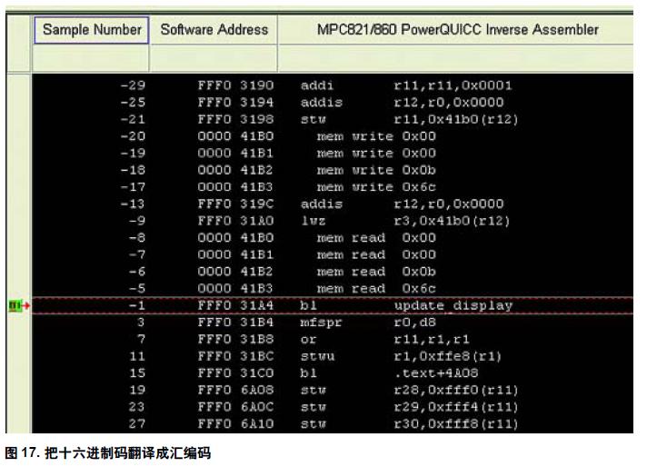 在使用處理器時,特定的十六進(jìn)制字符包含一個處理器指令。如果您很熟悉十六進(jìn)制代碼,就能查看這些類似圖13 所示的十六進(jìn)制代碼表,并知道它們代表的指令。但我們大部分人做不到這一點(diǎn)。因此,絕大多數(shù)分析儀制造商設(shè)計了稱為反匯編器的軟件包。這些軟件包把十六進(jìn)制代碼轉(zhuǎn)換成易于閱讀的匯編碼。例如圖13中有0000 41B0 和0000 41B1。我們可以從MotorolaPowerQUICC 手冊中查到它們代表存儲器寫0x00 指令。反匯編器可以為我們做這些事情,使我們不需要查找這些代碼。請查看圖17 并注意它們之間的差別。