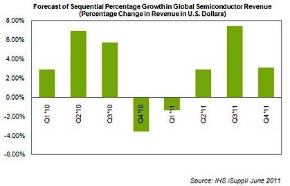 根據(jù)IHS的統(tǒng)計(jì),日本共有14家半導(dǎo)體供應(yīng)商與4家硅晶圓制造商受到地震沖擊。該機(jī)構(gòu)預(yù)期,全球半導(dǎo)體營收將在第三季獲得加強(qiáng)力道,當(dāng)季成長率可達(dá)7.4%,與日本廠商恢復(fù)全面生產(chǎn)相互呼應(yīng)。全球半導(dǎo)體營收成 長率在第一季呈現(xiàn)1.4%的衰退,第二季則是成長2.9,預(yù)期第四季可成長3.1%。