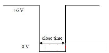 采用可控制開關(guān)的辦法難于完成測量,需采用其他辦法進(jìn)行繼電器觸點(diǎn)通斷過程的模擬。首先對繼電器觸點(diǎn)處電壓波形進(jìn)行分析,由于瞬時通斷測量儀接入抖閉觸點(diǎn)的電壓為6 V,通過抖斷觸點(diǎn)的電流為10 mA,當(dāng)繼電器觸點(diǎn)出現(xiàn)抖閉現(xiàn)象時電壓波形應(yīng)如圖3 所示(抖閉觸點(diǎn)在正常狀態(tài)時所加的+6 V 電壓在抖閉狀態(tài)時被直接短路,電位被鉗制在0 V),形成一個負(fù)跳變脈沖,其抖閉時間為脈沖寬度,而出現(xiàn)抖斷觸點(diǎn)的電壓波形如圖4 所示。