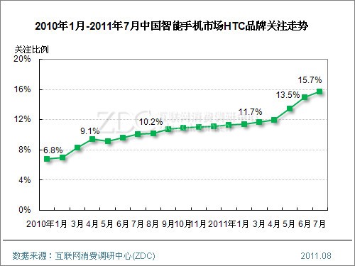 ZDC統(tǒng)計(jì)數(shù)據(jù)顯示,中國整體手機(jī)市場上,2010年1月至今,HTC品牌關(guān)注比例呈現(xiàn)出直線上升走勢,2010年1月僅為3.5%,如今已經(jīng)達(dá)到13.2%,且在中國手機(jī)市場品牌排名中躋身前三甲。