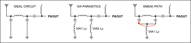 Maxim ISM-RF產(chǎn)品的數(shù)據(jù)資料往往建議使用盡可能短的高頻輸入、輸出引線,從而將損耗和輻射降至最小。另一方面,這種損耗通常是由于非理想寄生參數(shù)引起的,所以寄生電感和電容都會影響電路布局,使用盡可能短的引線有助于降低寄生參數(shù)。通常情況下,10 mil寬、距離地層0.0625in的PCB引線,如果采用的是FR4電路板,則產(chǎn)生大約19nH/in的電感和大約1pF/in的分布電容。對于具有20nH電感、3pF電容的LAN/混頻器電路,電路、元器件布局非常緊湊時,會對有效元件值造成很大影響。