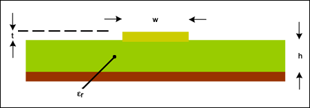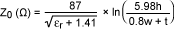 式中,εr為電介質(zhì)的介電常數(shù),h為引線距離地層的高度,w為引線寬度,t為引線厚度(圖7)。w/h介于0.1至2.0、εr介于1至15之間時,該公式的計算結(jié)果相當(dāng)準(zhǔn)確。