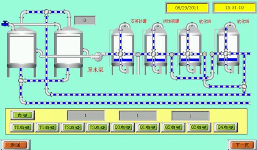制藥用水是不含任何添加物的工藝用水。制藥用水的系統(tǒng)控制要控制這些雜質(zhì)的含量,同時(shí)還要有效處理和控制微生物及細(xì)菌內(nèi)毒素的污染。通常會(huì)采用離子樹(shù)脂交換、蒸餾冷凝、電滲析、反滲透等工藝方式。其制備流程大致分為五部分:預(yù)處理、初級(jí)除鹽裝置、深度除鹽裝置、后處理裝置、純水輸送分配系統(tǒng)。純化水設(shè)備包含機(jī)械部分和電氣部分:機(jī)械部分主要由水泵、壓力罐、水箱、電磁閥、過(guò)濾器和管路組成;電氣部分主要由可編程控制器(PLC)、觸摸屏、變頻器、壓力表、繼電器等組成。圖1為制備純化水的一個(gè)現(xiàn)場(chǎng)展示案例。