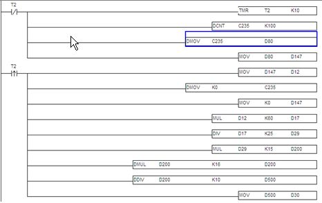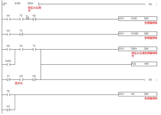 3.2.1測速程序:此部分程序原理就是采用PLC內(nèi)置的高速計(jì)算功能,計(jì)算單位時(shí)間內(nèi)從測速編碼器過來的脈沖數(shù),然后根據(jù)相關(guān)機(jī)械系數(shù)折算成線速度,這個(gè)值作為計(jì)算供水泵頻率的一個(gè)系數(shù),然后根據(jù)濕度設(shè)定值,計(jì)算出實(shí)際所需的供水頻率。見圖8。