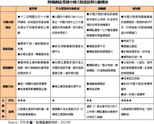 感知層一直以來(lái)都是臺(tái)廠之強(qiáng)項(xiàng),加上中國(guó)大陸目前技術(shù)較為薄弱,短期臺(tái)灣感測(cè)芯片廠具有較大之優(yōu)勢(shì)。應(yīng)用部分,智能電網(wǎng)與智能醫(yī)療在中國(guó)大陸將是最大的應(yīng)用領(lǐng)域與投資方向。但由于物聯(lián)網(wǎng)應(yīng)用范圍廣大,涉及各個(gè)層面,資源難以集中發(fā)展,臺(tái)廠可藉由差異化案例作為利基,將解決方案包裝后整案輸出。例如,臺(tái)灣目前推動(dòng)的智能生活計(jì)畫(huà),所積累的物聯(lián)網(wǎng)發(fā)展經(jīng)驗(yàn)及成熟技術(shù),如智能農(nóng)業(yè)、智能醫(yī)療、智能電表等,都是臺(tái)廠可藉力使力、搶攻物聯(lián)網(wǎng)應(yīng)用市場(chǎng)的機(jī)會(huì)。