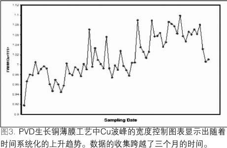 這種設(shè)備最初的一種應(yīng)用是監(jiān)測(cè)一系列物理氣相淀積(PVD)的反應(yīng)腔,這些反應(yīng)腔在銅互連金屬化制程中被用來(lái)淀積TaN/Ta/Cu襯墊層和籽晶層。這種監(jiān)測(cè)作為標(biāo)準(zhǔn)的平面電阻,膜厚量測(cè)的補(bǔ)充而存在。薄膜堆棧中Ta和Cu成分的織構(gòu)強(qiáng)度和譜線展寬數(shù)據(jù)都需要收集。TaN層具有無(wú)定形結(jié)構(gòu),因此無(wú)法監(jiān)測(cè)。圖3說(shuō)明了一個(gè)從銅元素峰寬控制圖表中輸出的例子。數(shù)據(jù)的趨勢(shì)穩(wěn)步向上,表明PVD銅籽晶的平均晶粒大小隨著時(shí)間在減小。圖4說(shuō)明了在相應(yīng)的Rs圖表中類似但并不十分顯著的增加。隨后的設(shè)備診斷發(fā)現(xiàn)受影響的反應(yīng)腔一個(gè)閥門有空氣泄漏的現(xiàn)象。泄漏影響到濺射工藝,進(jìn)而影響銅籽晶層的淀積,這一過(guò)程極有可能是在淀積和淀積之后的自退火過(guò)程中,由于銅在Ta表面的遷移率下降造成。更換了閥門之后,Rs和銅元素峰寬的值都變小,我們從圖3和圖4控制圖表中的最后三個(gè)數(shù)據(jù)點(diǎn)可以看出。
