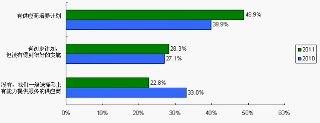 培養(yǎng)供應(yīng)商有利于建立供求雙方的伙伴關(guān)系,提高供應(yīng)商忠誠度,增強采購風險抵御能力。有供應(yīng)商培養(yǎng)計劃的系統(tǒng)廠商由2010調(diào)查的39.9%上升至2011調(diào)查的48.9%,而沒有計劃的由2010調(diào)查的33%降至22.8%。