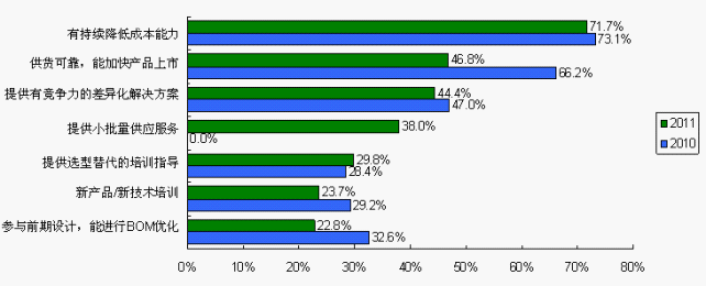 此外,工程師對成本降低持續(xù)關(guān)注,小批量供應(yīng)服務(wù)成為工程師關(guān)注的亮點。隨著市場的企穩(wěn),供貨可靠不再變成重大事件。2011中國電子制造商采購行為調(diào)查發(fā)現(xiàn),工程師對供貨穩(wěn)定可靠的期望由2010調(diào)查的66.2%大幅降至2011調(diào)查的46.8%。
