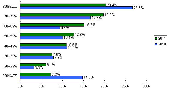 2011調(diào)查中國外品牌元器件占采購總額比例平均為58.6%,比2010調(diào)查的57.1%上升1.5%。采購國外品牌元器件占采購總額比例為70-79%、60-69%、50-59%三個區(qū)段的系統(tǒng)廠商占47.8%,是采購的主體,研發(fā)活動活躍,這三個部分呈現(xiàn)出對國外品牌元器件需求的快速增長。而采購國外品牌比例在80%以上和20%以下是采購的兩極,這兩極通過平衡采購比例來分散采購風險,因此,這兩極的系統(tǒng)廠商數(shù)量比2010調(diào)查有顯著降低。雖然2010年的元器件缺貨給國產(chǎn)元器件進入AVL(合格供應(yīng)商,Approved Vendor List)帶來機會,但是該趨勢還未對電子元器件供應(yīng)鏈整體產(chǎn)生顯著影響。