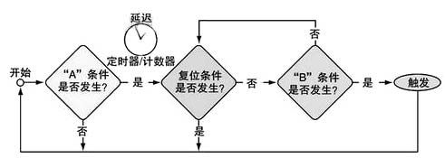 源自電腦編程領域的IF-THEN-ELSE構成了這類觸發(fā)結構的概念模型。如圖1所示,這些語句還包括其它判定符(如A和B之間的定時器/計數(shù)器)。不管B事件是否發(fā)生,在A事件之后隨時都可以發(fā)生復位。