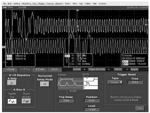 這些快速新協(xié)議中的錯誤可能來自多個事件的綜合結果,如邏輯狀態(tài)、偏移、瞬變、上升時間問題等。有時,必需規(guī)定非常精確的條件范圍,以確定難以捕捉的錯誤。這要求觸發(fā)工具系列能夠分析更多的條件。可以采用雙觸發(fā)排列來解決這一問題,其中B觸發(fā)系統(tǒng)與A系統(tǒng)基本上相同。只是在許多情況下,A條件相對簡單,而在理想情況下,B觸發(fā)器應能夠評估比較復雜的一套指標,如只在其它邏輯信號處于規(guī)定狀態(tài)時才會有效的事件數(shù)量等。但是,相關觸發(fā)B一直缺乏A觸發(fā)系統(tǒng)的靈活性。因此大多數(shù)示波器僅提供了非常簡單的B觸發(fā)器。