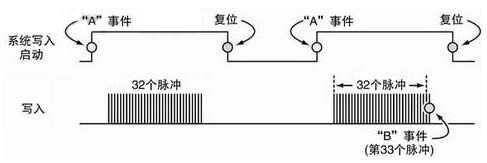 本系統(tǒng)中,讀/寫電路中的一個單元設計成在每個有效系統(tǒng)寫入啟動(WE)周期中執(zhí)行一串32條寫入命令。圖2描述了較大的周期時間與導致數(shù)據(jù)寫入的各個脈沖的關系。