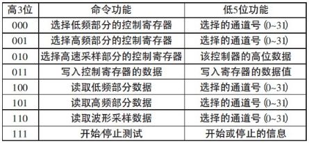 PC 機發(fā)送的控制字都是8 位的,其中高3 位為控制命令字,用來區(qū)分8 個命令,低5 位為輔助功能,具體見表3。FPGA 接收到主機發(fā)來的命令信號后,按命令執(zhí)行相應的操作。