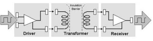 感應(yīng)隔離技術(shù)使用了一對(duì)通過一個(gè)絕緣層分離的線圈。該絕緣層防止任何物理信號(hào)的傳輸。信號(hào)可以通過改變流經(jīng)其中一個(gè)線圈的電流進(jìn)行傳輸,因?yàn)檫@樣會(huì)使跨過該絕緣層在第二個(gè)線圈中產(chǎn)生類似的感應(yīng)電流。感應(yīng)隔離技術(shù)可以提供與電容技術(shù)相似的高速傳輸。但是由于感應(yīng)耦合涉及到用于數(shù)據(jù)傳輸?shù)拇艌?chǎng)的使用,因此它易受到外部磁場(chǎng)的干擾。