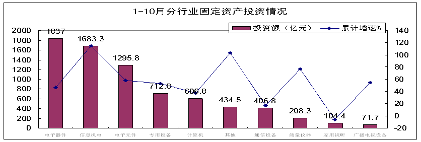 今年1-10月,電子信息產(chǎn)業(yè)固定資產(chǎn)投資持續(xù)高速增長,500萬元以上項目完成固定資產(chǎn)投資7361億元,同比增長60.1%,增速高于工業(yè)投資33.5個百分點。但從9月份開始,投資增速開始回落,9、10月份分別同比增長35.6%和44.4%,增速低于8月份(70.8%)35.2和26.4個百分點,同時10月份完成投資869.5億元,環(huán)比下降2.3%。
