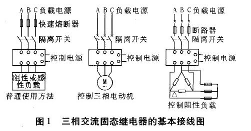 單相SSR為四端有源器件,其中兩個輸入控制端,兩個輸出端,輸入輸出間為光隔離,輸入端加上直流或脈沖信號到一定電流值后,輸出端就能從斷態(tài)轉(zhuǎn)變成通態(tài)。而三相交流固態(tài)繼電器則是集三只單相交流固態(tài)繼電器為一體,并以單一輸入端對三相負(fù)載進(jìn)行直接開關(guān)切換,可方便地控制l一相交流電機(jī)、加熱器等三相負(fù)載,圖1為三相交流固態(tài)繼電器的基本接線圖。三相交流固態(tài)繼電器的相與相問,輸入輸出間,以及與基板之間絕緣電壓大于2 000 VAC,其他基本指標(biāo)與相應(yīng)的單相固態(tài)繼電器相同。需要指出的是對實(shí)際負(fù)載電流不大的場合,比如實(shí)驗(yàn)室教學(xué),三相SSR使用起來比較方便,但電流大時發(fā)熱亦大,這時使用三只單相SSR更為可靠。