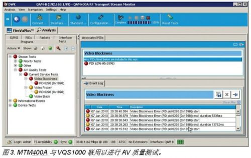 除了附加有視頻PID帶寬測量以外,VQS1000的顯示和操作幾乎與MTM400A的文件模式應用一樣。VQS1000的另一項功能是當它與MTM400A聯(lián)用時,所有的觸發(fā)均通過SNMP返回到MTM400A。此外,還有一項測試稱為AV質量測試也是很有用的,如圖3所示,MTM400A可以跟蹤VQS1000黑幀、凍結幀和塊效應測量的觸發(fā)事件。