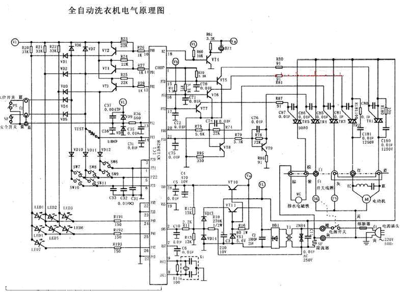 晶體管T11、T10和穩(wěn)壓管DW組成欠壓保護電路。當電源電壓不足,T11的基極電壓小于3.9V時,T11截止,T10也截止。Z86C09的P3.1端沒有電壓,常為低電平。T12截止,造成T5~T9的發(fā)射極均懸空,因此T5~T9截止,不受Z86C09控制。這時,雖然Z86C09能夠正常工作,但外圍控制元件全部關斷,洗衣機不工作。單片機的P3.1端輸入判別欠壓保護電路工作狀態(tài)的信號,只有當電壓正常后,單片機才開始執(zhí)行洗衣程序。