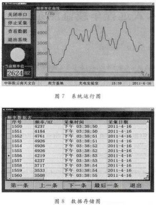 仿真通過之后,就可以按照圖3搭建硬件電路來進(jìn)行硬件的運(yùn)行測試。在此使用VB 6.0來編寫上位機(jī)軟件,同時配合Access數(shù)據(jù)庫來存儲PIC18F452上傳的頻率數(shù)據(jù)。系統(tǒng)的運(yùn)行效果如圖7,圖8所示。