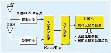 VIPER被設計成在最少的RF硬件條件下,在軟件中實現(xiàn)處理功能。圖4給出了接收器硬件的模塊示意圖。執(zhí)行單階下變頻后,在四個信道的每一個信道的IF信號以每秒1G的采樣率被采樣。所采集樣本信號存儲在RAM中,并由計算機處理。