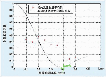 圖5:在市區(qū)、非LOS環(huán)境下,空間分集測量中封包(envelope)相關系數與天線間隔關系