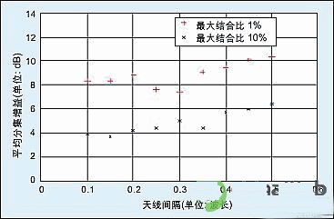 圖6:在市區(qū)、非LOS環(huán)境下,空間分集測量中平均分集增益與天線間隔關系圖