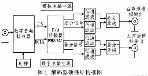 圖1是該解碼器硬件結(jié)構(gòu)框圖,其中數(shù)字音頻接收器采用CirrusLogic公司的高速數(shù)字音頻接收器CS8416,該器件支持包括S/PDIF在內(nèi)的多種音頻輸入,取樣頻率范圍為32~192kHz。CS8416通過I2S接口與WM8741相連接。I2S總線只處理音頻數(shù)據(jù),其他控制信號必須單獨(dú)傳輸。CS8416的工作原理:接收器把接收到的S/PDIF格式的數(shù)字音頻數(shù)據(jù)進(jìn)行解碼轉(zhuǎn)換,同時(shí)重建音頻數(shù)據(jù)中的時(shí)鐘并提供給后續(xù)WM8741,音頻數(shù)據(jù)則通過I2S總線接口發(fā)送給WM8741。WM8741按照設(shè)定的參數(shù)完成數(shù)模轉(zhuǎn)換后,再以差分形式輸出左右通道的模擬音頻信號,并經(jīng)低通濾波器濾除高頻諧波噪聲,最終得到高質(zhì)量模擬電壓信號。如果輸出接口為RCA,還需將差分信號轉(zhuǎn)換為單端信號。