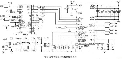 CS8416具有多個(gè)可選的音頻輸入接口。該系統(tǒng)設(shè)計(jì)是將CS8416的引腳RXSEL1接高電平,引腳RXSEL0接地,選擇引腳RXP3作為音頻數(shù)據(jù)輸入接口。音頻時(shí)鐘重建通過片上的鎖相環(huán)(PLL)實(shí)現(xiàn),該鎖相環(huán)不需要過多地改變外部元件即可在很大范圍內(nèi)鎖定輸入音頻數(shù)據(jù)中的取樣頻率Fs。但外接電阻電容組成的濾波電路也會(huì)影響其頻率變化范圍。為了獲得一個(gè)低抖動(dòng)的重建時(shí)鐘,外接濾波器的電阻電容值如圖2所示。