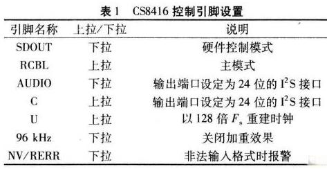 CS8416是數(shù)字音頻信號接收電路的核心。在軟件控制方式下,MCU通過SPI或I2C接口沒置參數(shù)。該方式還可靈活更改內(nèi)部配置。在無MCU時(shí)則通過硬件控制方式改變其特定引腳電平實(shí)現(xiàn)控制。由于本系統(tǒng)中無MCU,因此采用硬件控制方式。在SDOUT引腳上用一只47kΩ電阻下拉至地即可,且引腳AUDIO、RCBL、U、C等不能懸空,必須通過一只47kΩ電阻上拉至高電平或下拉至低電平,以便系統(tǒng)復(fù)位后,CS8416通過檢測這些引腳電平?jīng)Q定其工作狀態(tài)。表1為該系統(tǒng)設(shè)計(jì)的控制引腳的配置。