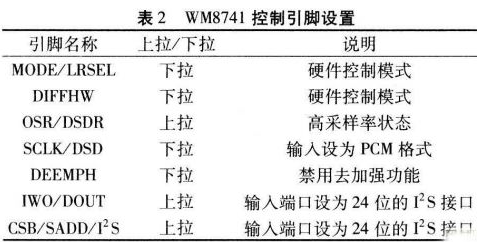 WM874l的I2S輸入接口與CS8416的輸出連接時(shí)中間加入100Ω電阻進(jìn)行緩沖,如圖2所示。WM874l設(shè)定硬件控制模式,即通過特定引腳的上拉或下拉狀態(tài)決定其工作狀態(tài),且所有上拉或下拉的電阻均為10kΩ。該系統(tǒng)設(shè)計(jì)的WM8741控制引腳設(shè)置如表2所示。