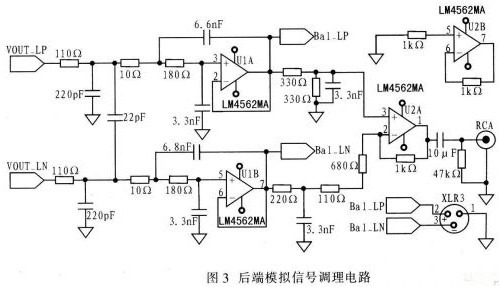WM8741輸出的模擬信號中夾雜高次諧波分量,因此需經(jīng)低通濾波濾除高頻噪聲,進(jìn)而得到較為純凈的模擬信號。濾波電路采用LM4562型運(yùn)算放大器。對于數(shù)模轉(zhuǎn)換電路,在D/A轉(zhuǎn)換器的后面需采用3階濾波器才能達(dá)到防混疊要求。由LM4562外加電阻電容組成的三階巴特沃斯低通濾波器,如圖3所示。濾波器是單位增益,通頻帶內(nèi)平坦度好。經(jīng)濾波后的信號可直接作為解碼器的平衡信號輸出。當(dāng)以RCA接口輸出時(shí),還需把差分信號轉(zhuǎn)換為單端信號,該轉(zhuǎn)換電路是由一片LM4562組成的差動(dòng)放大電路。單端信號經(jīng)一只10μF的隔直電容輸出到RCA接口。LM4562采用單獨(dú)的±12V電源供電。
