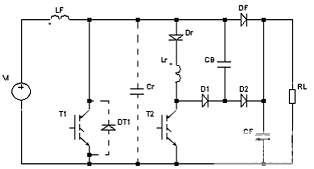 可見,該拓?fù)浣Y(jié)構(gòu)實現(xiàn)了主開關(guān)管T1和輸出整流二極管DF在零電壓下導(dǎo)通和關(guān)斷,輔助開關(guān)管T2在零電流下導(dǎo)通和零電壓下關(guān)斷,兩個開關(guān)管都是軟通斷,克服了普通ZVT-PWM變換器的輔助開關(guān)管為硬通斷的缺點,減少了關(guān)斷損耗。