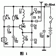 圖1是較為經(jīng)典的1.5km單管調(diào)頻發(fā)射機(jī)電路。電路中的關(guān)鍵元件是發(fā)射三極管,多采用D40,D5O,2N3866等。工作電流為60--80mA。但以上三極管難以購(gòu)到,且價(jià)格較高,假貨較多。筆者選用其他三極管實(shí)驗(yàn),相對(duì)易購(gòu)的三極管C2053和C1970是相當(dāng)不錯(cuò)的,實(shí)際視距通信距離大于1.5km。筆者也曾將D40管換成普通三極管8050,工作電流有60--80mA,但發(fā)射距離達(dá)不到1.5km,若改換成9018等,工作電流更小,發(fā)射距離也更短,電路中除了發(fā)射三極管以外;線圈L1和電容C3的參數(shù)選擇較重要,若選擇不當(dāng)會(huì)不起振或工作頻率超出88--108MHz范圍。其中L1,L2可用0.31mm的漆包線在3.5mm左右的圓棒上單層平繞5匝及10匝,C3選用5-20pF的瓷介或滌綸可調(diào)電容。實(shí)際制作時(shí),電容C5可省略,L2上也可換成10-100mH的普通電感線圈。若發(fā)射距離只要幾十米,那么可將電池電壓選擇為1.5-3V,并將D40管換成廉價(jià)的9018等,耗電會(huì)更少,也可參考《電子報(bào)》2000年第8期第五版(簡(jiǎn)易遠(yuǎn)距離無(wú)線調(diào)頻傳聲器)一文后稍作改動(dòng)。圖1介紹的單管發(fā)射機(jī)具有電路簡(jiǎn)單,輸出功率大,制作容易的特點(diǎn),但是不便接高頻電纜將射頻信號(hào)送至室外的發(fā)射天線,一般是將0.7--0.9m的拉桿天線直接連在C5上作發(fā)射的,由于多普勒效應(yīng),人在天線附近移動(dòng)時(shí),頻漂現(xiàn)象很?chē)?yán)重,使本來(lái)收音正常的接收機(jī)聲音失真或無(wú)聲。若將本發(fā)射機(jī)作無(wú)線話筒使用,手捏天線時(shí),頻漂有多嚴(yán)重就可想而知了。