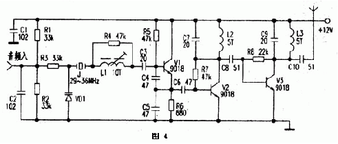 圖4為晶振式發(fā)射機(jī)電路。電路中J.、VD1、L1、C3~C5、V1組成晶體振蕩電路。由于石英晶體J的頻率穩(wěn)定性好,受溫度影響也較小,所以廣泛用于無(wú)繩電話及AV調(diào)制器中。Vl是29~36MHz晶體振蕩三極管,發(fā)射極輸出含有豐富的諧波成分,經(jīng)V2放大后,在集電極由C7、L2構(gòu)成諧振于88-108MHz的網(wǎng)絡(luò)選出3倍頻信號(hào)(即87~108MHz的信號(hào)最強(qiáng)),再經(jīng)V3放大;L3、C9選頻后得到較理想的調(diào)頻頻段信號(hào)。頻率調(diào)制的過(guò)程是這樣的,音頻電壓的變化引起VD1極間電容的變化;由于VD1與晶體J串聯(lián),晶體的振藩頻率也發(fā)生微小的變化,經(jīng)三倍頻后,頻偏是29-36MHz晶體頻偏的3倍。實(shí)際應(yīng)用時(shí),為獲得合適的調(diào)制度,可選擇調(diào)制頻偏較大的石英晶體或陶瓷振子,也可以采用電路稍復(fù)雜的6-12倍頻電路。若輸入的音頻信號(hào)較弱;可加上一級(jí)電壓放大電路。
