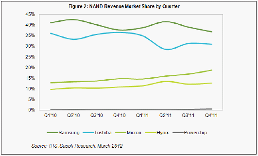 在材料方面,晶圓供應商在一個月后就快速恢復了生產(chǎn),并提高了其它地點的產(chǎn)量,使其主要客戶面臨的供應短缺問題降低最小。中期來看,這場災害實際上導致NAND市場更加接近供需平衡,幫助該產(chǎn)業(yè)的營業(yè)收入在2011年第三季度環(huán)比增長10.0%,而2010年第三季度是環(huán)比增長9.1%。