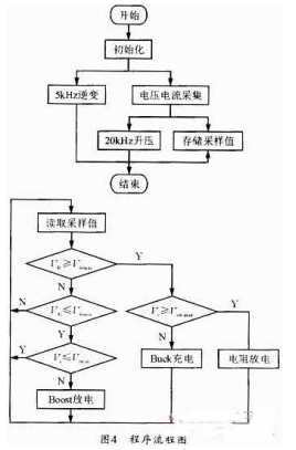 按照上述控制策略,得到如圖4的程序流程圖,其中5kHz逆變?yōu)榫鶋弘娐分械哪孀兤?,采?0%的PWM脈沖波來實(shí)現(xiàn),不需要復(fù)雜的控制算法。20kHz升壓模塊完成開關(guān)管S1信號的產(chǎn)生。需要通過電壓采集電路,得到串聯(lián)電容的總電壓。4個(gè)判斷模塊通過判斷Vdc和Vc的電壓范圍決定對電容的充放電控制。