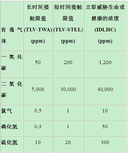 在美國(guó),國(guó)家職業(yè)安全與健康研究所(NIOSH)和美國(guó)政府工業(yè)衛(wèi)生學(xué)家會(huì)議(ACGIH)已規(guī)定了許多有毒工業(yè)氣體的短時(shí)間和長(zhǎng)時(shí)間接觸限值。"閾限值-時(shí)間加權(quán)平均值"(TLV-TWA)是指大多數(shù)工人可以在正常8小時(shí)工作日內(nèi)反復(fù)接觸而不會(huì)受到有害影響的時(shí)間加權(quán)平均濃度。"閾限值-短時(shí)間接觸限值"(TLV-STEL)是指大多數(shù)工人可以短時(shí)間接觸而不會(huì)受到刺激或傷害的濃度。"立即威脅生命或健康的濃度"(IDLHC)是一種限制性濃度,它會(huì)對(duì)生命立即或緩慢產(chǎn)生威脅,導(dǎo)致不可逆轉(zhuǎn)的健康損害,或者影響工人獨(dú)立逃生的能力。表1列出了幾種常見氣體的限值。