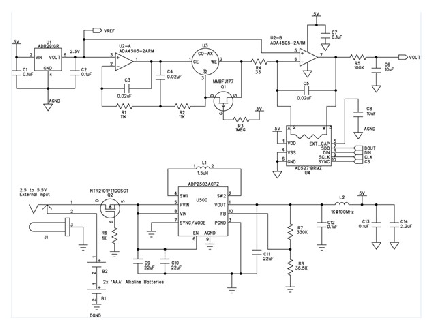 該電路由兩節(jié)AAA電池供電。使用二極管提供反向電壓保護(hù)會(huì)浪費(fèi)寶貴的電能,因此本電路使用P溝道MOSFET (Q2)。該MOSFET通過阻塞反向電壓來(lái)保護(hù)電路,施加正電壓時(shí)導(dǎo)通。MOSFET的導(dǎo)通電阻小于100 mΩ,因此它引起的壓降遠(yuǎn)小于二極管。除AAA電池以外,降壓-升壓調(diào)節(jié)器ADP2503還允許使用最高5.5 V的外部電源。在省電模式下工作時(shí),ADP2503的功耗僅38 μA.由L2、C12和C13構(gòu)成的濾波器可消除模擬電源軌產(chǎn)生的任何開關(guān)噪聲。連接外部電源時(shí),該儀表不是通過一個(gè)電路來(lái)斷開電池,而是利用一個(gè)插孔以機(jī)械方式斷開電池,從而避免電能浪費(fèi)。