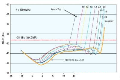 如圖3所示,為了符合鄰道功率抑制比(ACPR)的要求,DC-DC轉(zhuǎn)換器的輸出電壓必須隨著發(fā)射功率電平的變化而變化。在0d Bm到20d Bm的功率電平范圍內(nèi),電池電流可節(jié)省多達(dá)50mA。圖2表示的是功率放大器在大多數(shù)時(shí)間內(nèi),運(yùn)行在這樣的功率電平范圍內(nèi)?! ?br />