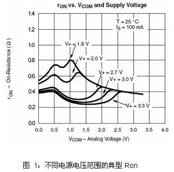 RON會隨著供電電壓的增加而減小,圖1顯示了上海英聯(lián)的UM4684在不同電源電壓上所測得的RON。導(dǎo)通電阻平坦度(RFLAT)即表示RON隨著VIN在0V至VCC或V-至V+)間變化而變化的情況,是引起THD的主要因素?! ?br />