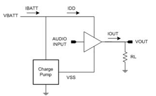 其中的技巧是設(shè)計(jì)將電池電壓降低至較低電壓的放大器,并使用適應(yīng)性電源軌 (分別有負(fù)電源軌) 降低播放音樂時(shí)整個(gè)輸出 FET 的電壓降幅。其中一種實(shí)現(xiàn)這類放大器的方式是,使用電荷泵作為圖 8 所示的步降區(qū)塊。某些工程人員偏好這類做法,原因在于步降電荷泵僅需要相對(duì)較小的飛馳電容(flying capacitor) (1μF 至 2.2μF),而這也是相對(duì)較小的組件