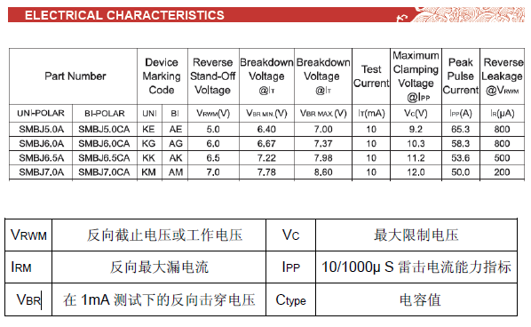 • VRWM :截止電壓必須大于被保護(hù)的電路的最大工作電壓