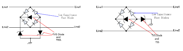 • 在較高數(shù)據(jù)傳輸頻率上,盡量采用低電容系列的產(chǎn)品B6A、B8C、SAC、LCE或通過二極管作降容處理,參考如示意圖2001 ABD、ISO7637 汽車電子等標(biāo)準(zhǔn)