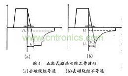 電路原理圖如圖3(a)所示,N3為去磁繞組,S2為所驅(qū)動(dòng)的功率管。R2為防止功率管柵極、源極端電壓振蕩的一個(gè)阻尼電阻。因變壓器漏感較小,且從速度方面考慮,一般R2較小,故在分析中忽略不計(jì)。其工作波形分為兩種情況,一種為去磁繞組導(dǎo)通的情況,見(jiàn)圖4(a);一種為去磁繞組不導(dǎo)通的情況,見(jiàn)圖4(b)。