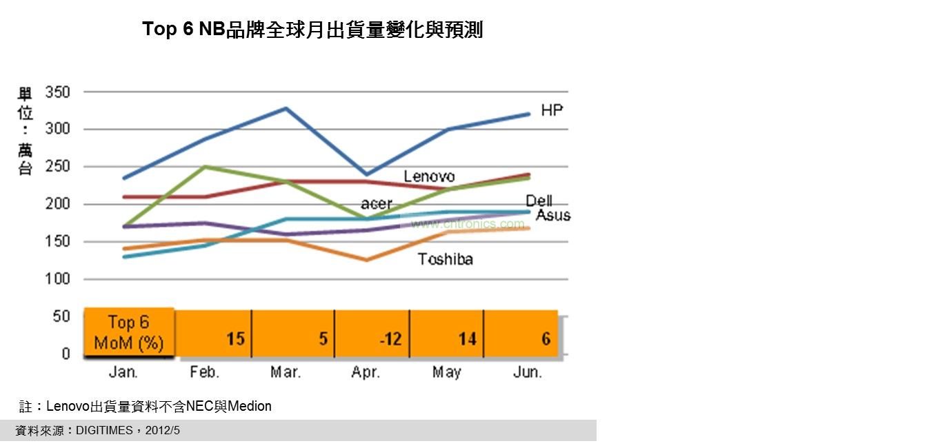 DIGITIMES Research資深分析師兼主任簡佩萍分析,品牌與代工廠NB月出貨量方面,在歷經(jīng)低迷的4月后,5月搭配英特爾(Intel)新品NB鋪貨效應(yīng),出現(xiàn)兩位數(shù)的月成長幅度;但整體而言仍較先前預(yù)測的出貨成長緩和許多,尤其對6月份的出貨展望,全球前6大品牌普遍保守,預(yù)期前6大品牌月NB出貨量成長幅度也將因此驟降至個(gè)位數(shù)。