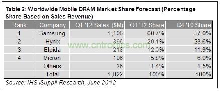 移動市場第一季度占總體DRAM營業(yè)收入的28.0%。第一季度mDRAM平均銷售價格(ASP)為1.72美元每GB,仍然高于商品類DRAM,后者價格是0.52美元每GB。但是,由于商品類DRAM價格預計下半年上漲,而mDRAM價格總體下降,所以目前移動DRAM所擁有的價格升水今年將逐漸縮小。與此同時,2012年移動DRAM營業(yè)收入將繼續(xù)增長,其比特出貨量預計下半年勁增20%以上。