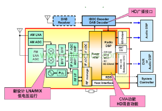 圖4是安森美半導(dǎo)體DSP調(diào)諧器的框圖。從圖中可以看出,模擬前端是新設(shè)計的新設(shè)計LNA和MIX,可低電壓運行,只需5 V供電;數(shù)字后端可以支持廣播接口。DSP采用CMA算法,具有HD混音功能。