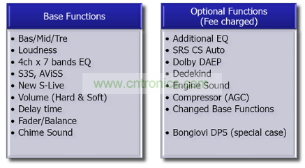 左邊表中是一些基本功能,其中S3S、AViSS、New S-Live是安森美半導(dǎo)體自己的算法,可免費提供給客戶;右邊是可供選擇的算法,需要使用授權(quán),或更改時需要研發(fā)費用,其中包括業(yè)界知名的SRS CS Auto及Dolby DAEP算法,而Bongiovi DPS是最先進(jìn)的音效處理技術(shù)。安森美半導(dǎo)體目前是該技術(shù)唯一的IC合作伙伴。